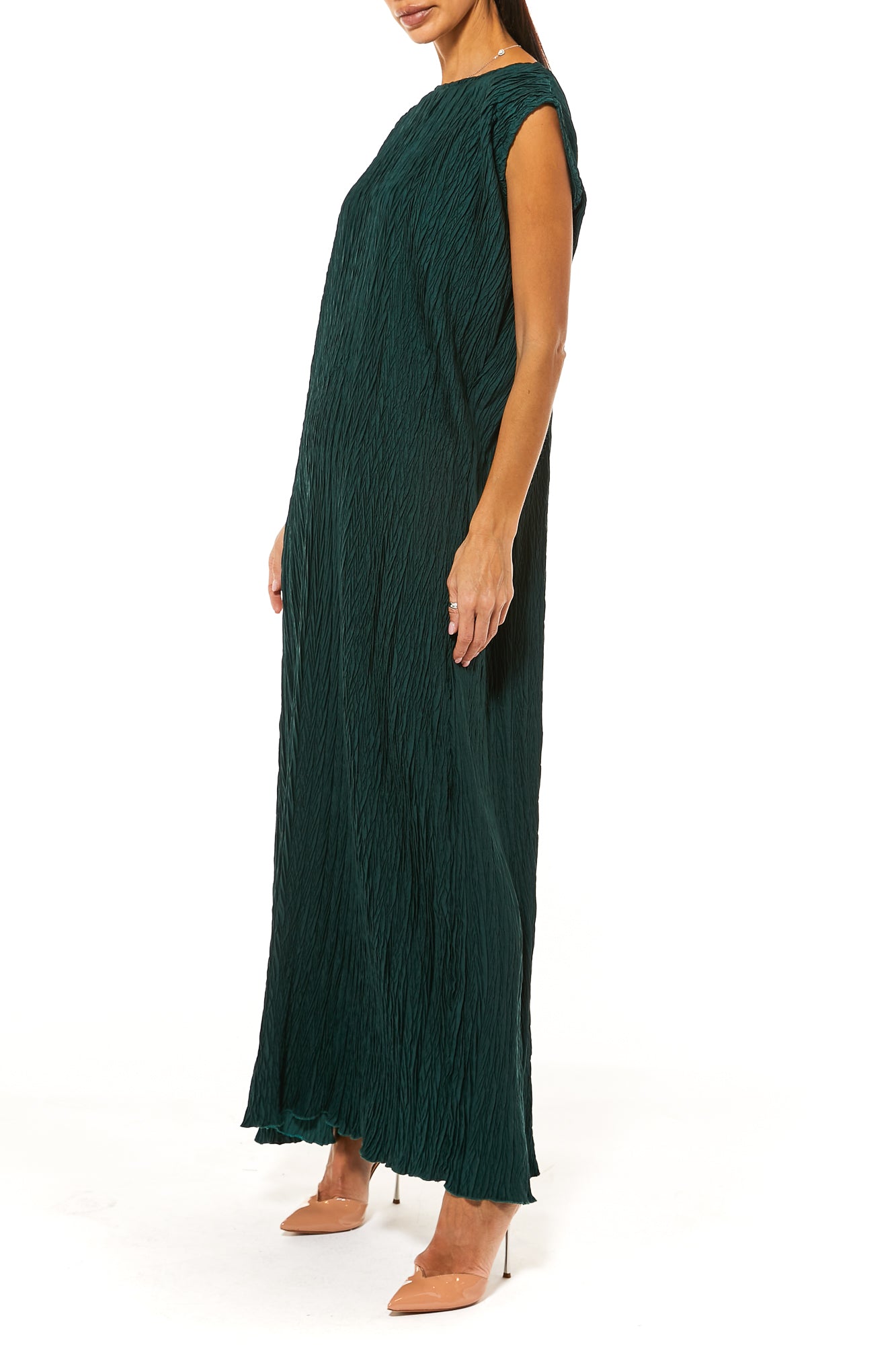 فستان باللون الأخضر مصنوع من قماش حرير مقصود بدون أكمام و بقصة مريحة. سيعزز مستوى الأناقة و الراحة.
