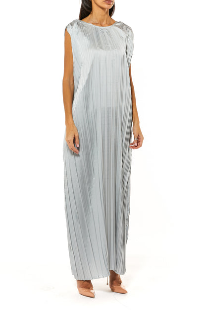 فستان باللون الرمادي مصنوع من قماش حرير بدون أكمام و بقصة مريحة. سيعزز مستوى الأناقة و الراحة.