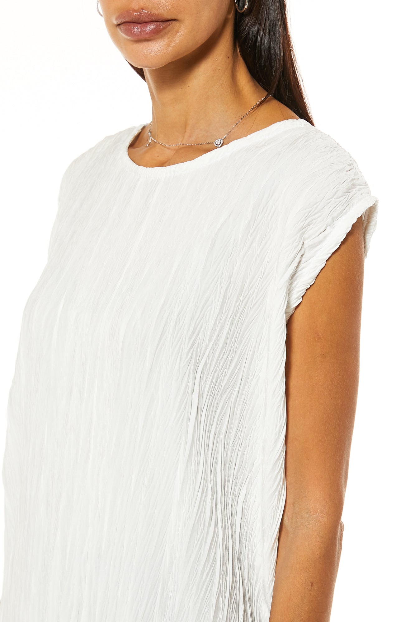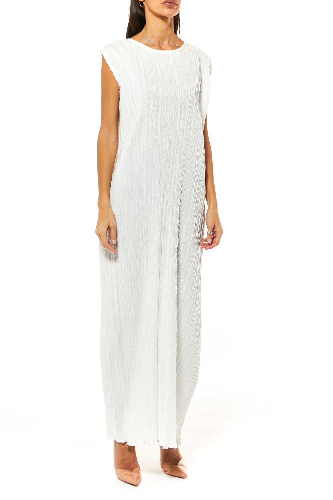 فستان باللون الأبيض مصنوع من قماش حرير مقصود مسحوق بدون أكمام و بقصة مريحة. سيعزز مستوى الأناقة و الراحة.